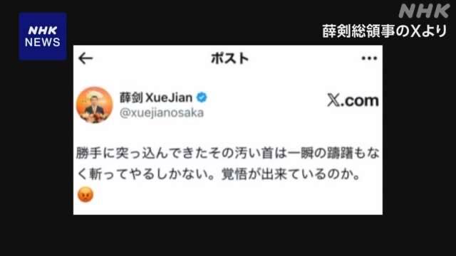 针对高市这一表态,中国驻大阪总领事馆总领事薛剑8日在社交平台X上引用相关报道,并评论称“擅自闯入的肮脏头颅,只能毫不犹豫地立即斩下,你做好准备了吗”,引发争议。薛剑随后删除了这一帖文。