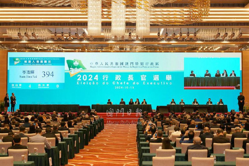 澳门第六任行政长官选举完成唱票,唯一候选人岑浩辉共得到394票,另有4票空白票,岑浩辉当选第六任行政长官候任人。