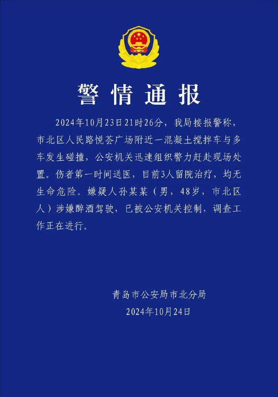 山东青岛一混凝土搅拌车10月23日晚间连撞多车,致3人留院治疗,均无生命危险。嫌疑人孙某某(男,48岁)涉嫌醉酒驾驶已被警方控制。