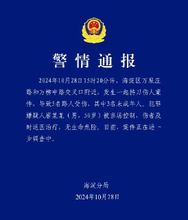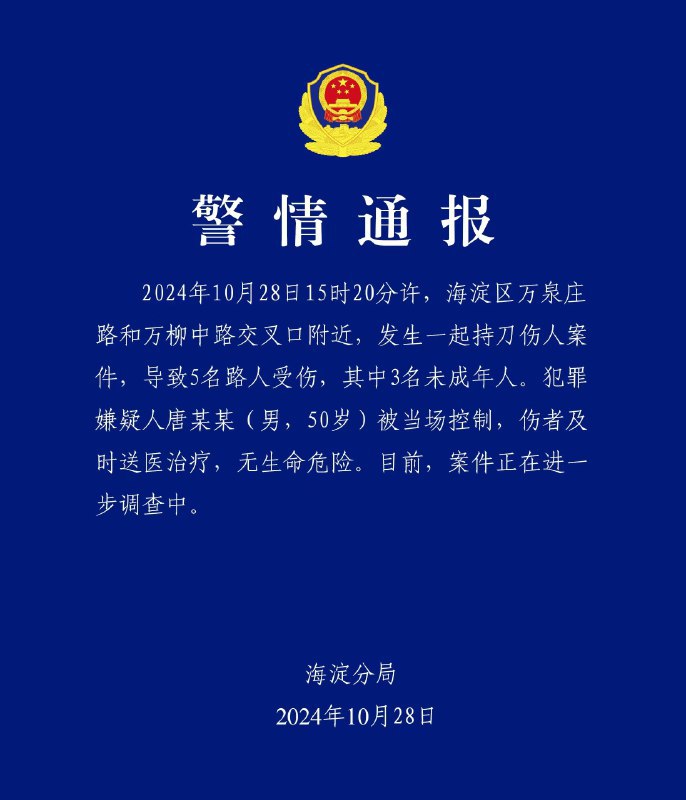 北京海淀,中关村三小北校区外10月28日15:20有人持刀伤人,3名未成年人、2名成年人受伤,伤者无生命危险。嫌犯唐某某(50岁男)被当场控制。
