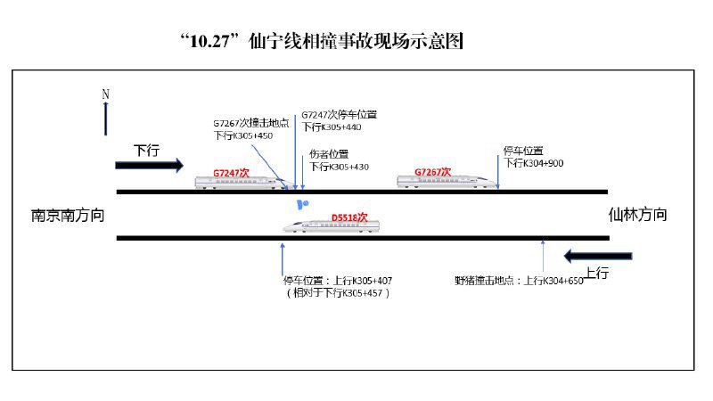 D5518次当日17:08行至紫金山东–南京南区间,撞上闯入线路的野猪。随车机械师下车排查时,被对向通过的G7267次撞击身亡。路方随后安排G7247次从南京南开出,沿线寻找被撞者,送往医院抢救。