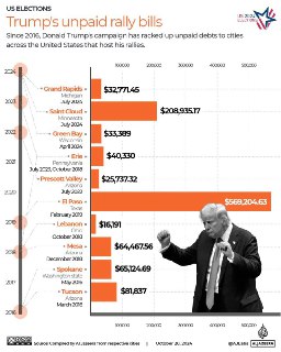 得克萨斯州埃尔帕索市和亚利桑那州梅萨市试图通过律师索要欠款但无果。多个地区已要求特朗普竞选团队在举行集会前预先支付相关费用。